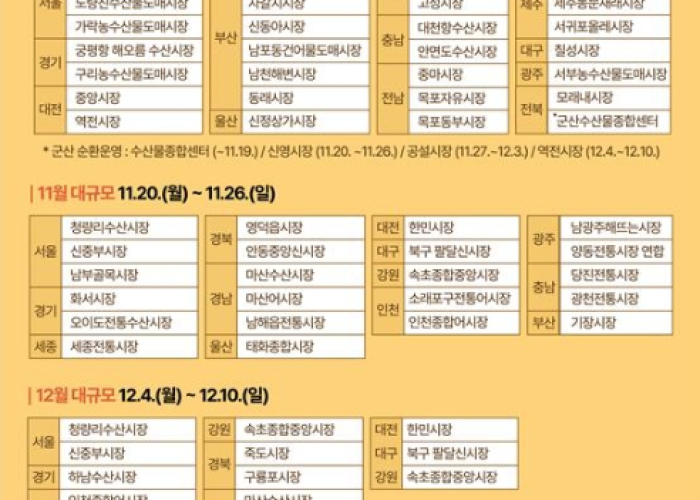 해양수산부는 김장철을 맞아 오는 20일부터 연말까지 대한민국 수산대전-온누리상품권 환급행사를 확대 개최한다고 19일 밝혔다.온누리상품권 환급은 시장에서 구매한 국산 수산물 금액의 일부를 온누리상품권으로 환급해주는 행사다.해수부는 당초 53개 시장에서 행사를 진행할 계획..
